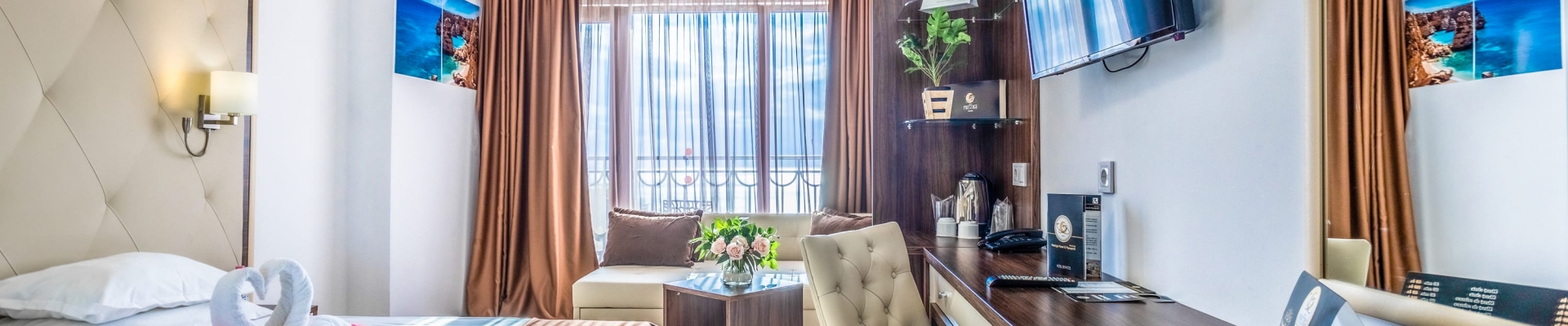 Премиум стаята е нашата най-нова реновирана стая. Състои от едно помещение със спалня, зона за релакс, собствена баня и балкон с външни мебели. Оборудвана е с централен климатик, сейф, мини хладилник, електрическа кана, интернет, телевизор със сателитни канали, душ и/или вана, сешоар и тоалетни принадлежности.